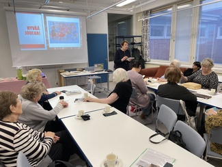 Kokoontumisen lopuksi Mallu Saarinen ohjasi tuolijumpan, jolla saa mukavasti liikkuvuutta niveliin ja lämpöä lihaksiin.