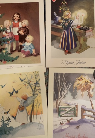 Lottaperinneyhdistyksen marraskuun tapaamisessa ennakoitiin jo joulunaikaa ja joulupostin lähettämistä. Aulikki Kuisma kertoi kuulijoille joulukorttiperinteen historiasta. Hänen johdollaan myös keskusteltiin aiheesta vilkkaasti eli aihe oli osallistujille mieluinen. Kuvassa Marja Anttila esittelee saamistaan joulukorteista eri joulukorttityyppejä. Hänelle rakkaimpia ovat Martta Wendelinin kortit. Osallistujia tuntui ilahduttavan suuresti varsinkin itsetehdyt kortit. Näytteillä oli myös Pirjo Vaanon joulumerkkikokoelma. Ulla-Maija Heinarolla oli mukanaan pojaltaan saama joulukortti Golanilta ja siihen liittyvä koskettava runo joulun sanomasta ja sodasta. Annikki Heikkilä oli tuonut nähtäväksi pinkan Aliina Martinantin joulukortteja viime vuosisadan alkupuolelta. Aliina oli kansakoulunopettajana Loiman koululla. Sota-ajan joulutervehdyksiä edusti lotan lähettämä joulumuistaminen Rukavaaralta vuodelta 1943.