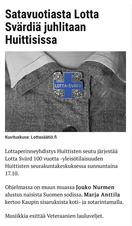 ![]() Lotta Svärd 100 vuotta Lähde: Lauttakylä 10.11.2021 | ![]() Lotta Svärd 100 vuotta Lähde: Lauttakylä 10.11.2021 |